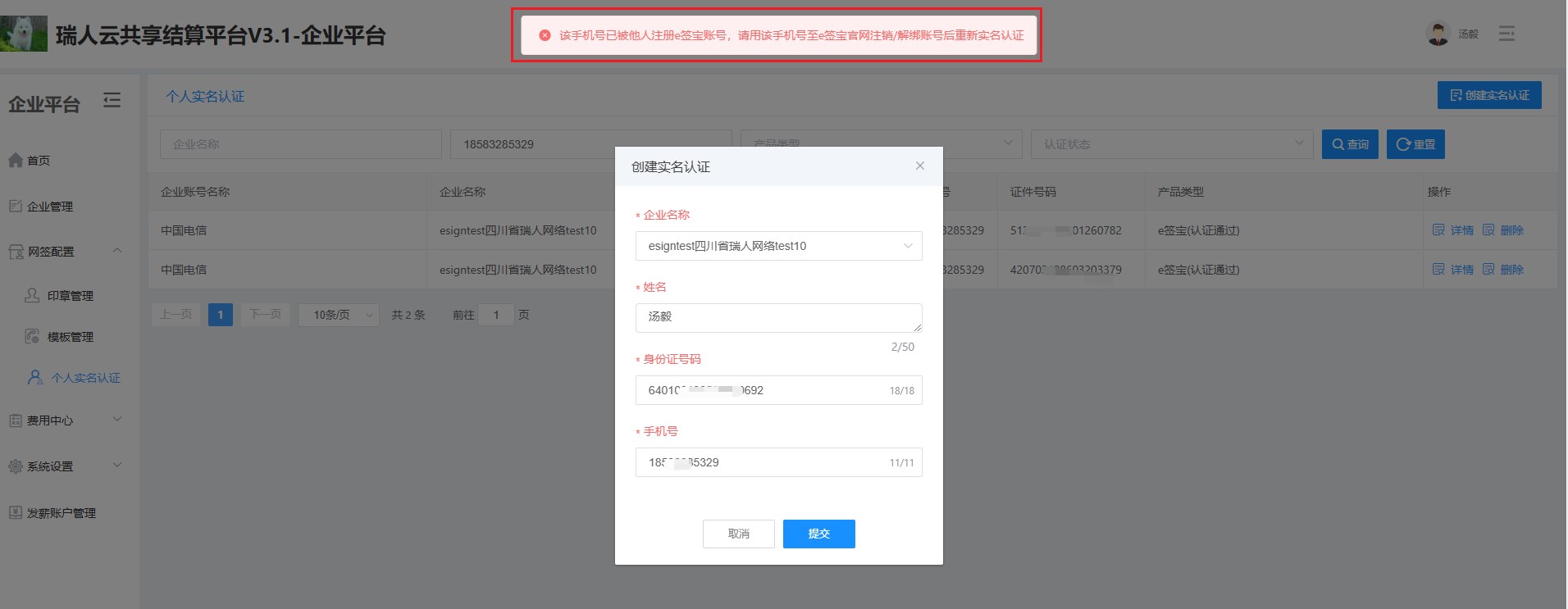 2、在企业端创建经办人实名认证记录时,如果出现下述报错,需要在e签宝官网先解绑身份证信息或者注销账号,再回结算平台进行实名认证;